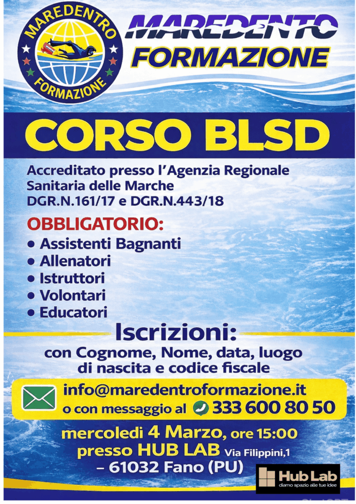 CORSO BLSD Accreditato presso l’Agenzia Regionale Sanitaria delle Marche DGR.N.161/17 e DGR.N.443/18 OBBLIGATORIO: assistenti Bagnanti, allenatori, Istruttori, Volontari, Educatori. Iscrizioni con Cognome, Nome, data, luogo di nascita e codice fiscale.